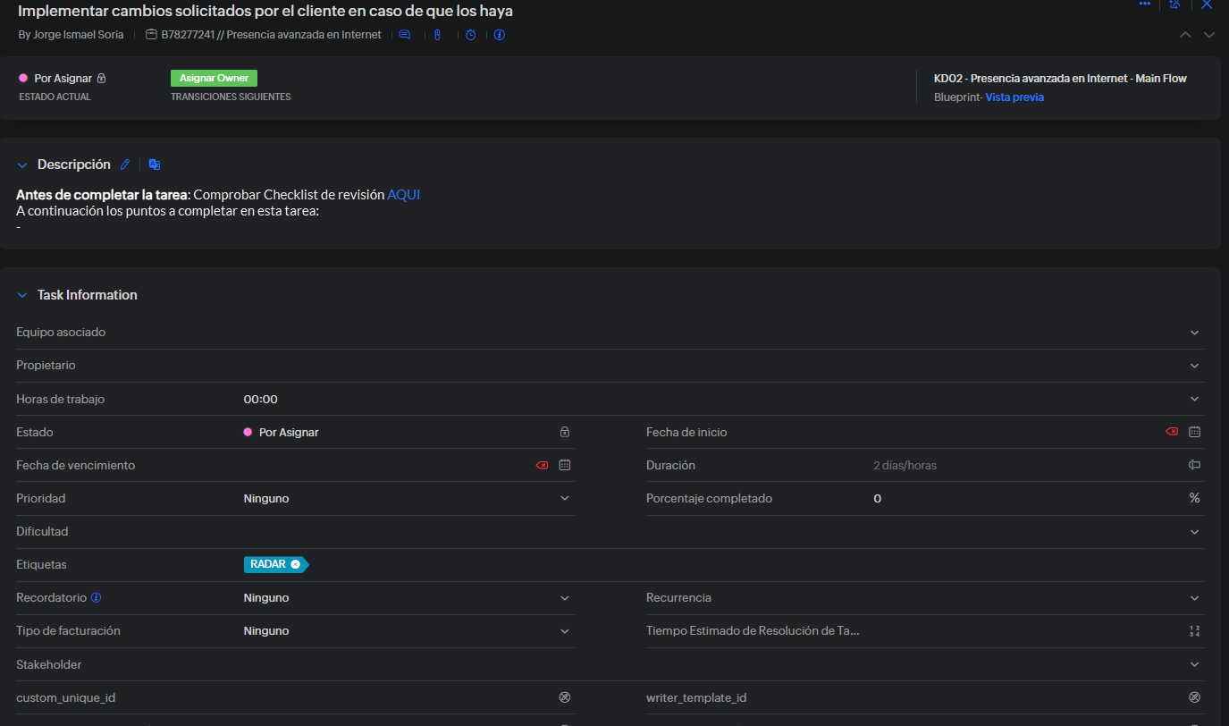 Desistimiento- Cliente solicita cambios: Se crea SAV con los cambios solicitados en el ticket. Esta SAV debe quedar etiquetada con la etiqueta RADAR como en la siguiente captura y en estado "Por Asignar". Dentro de esta tarea indicaremos los cambios solicitados por el cliente junto con el link del ticket desde donde provienen estos cambios.